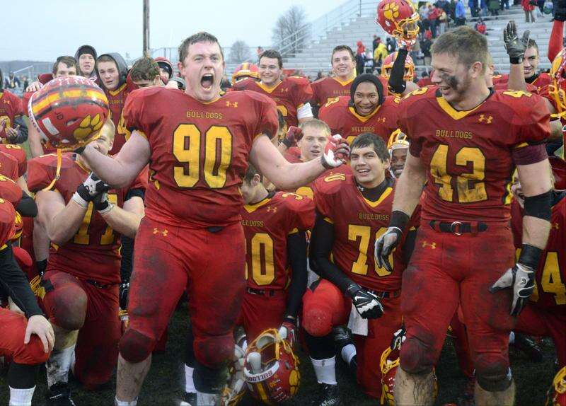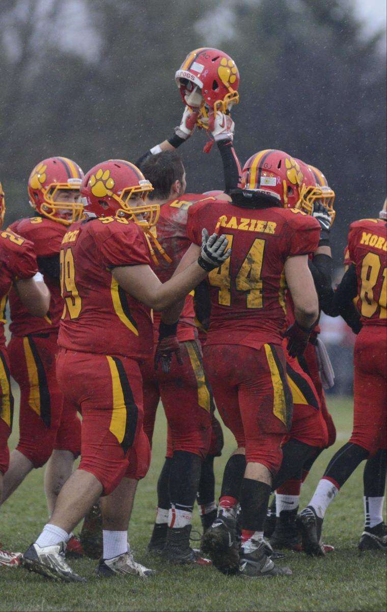 Batavia’s Ryan Minniti screams in victory in the post game huddle after beating Lake Forest in the Class 6A quarterfinal on Saturday, November 16. Teammate Kevin Green on right. (42) Laura Stoecker/lstoecker@dailyherald.com