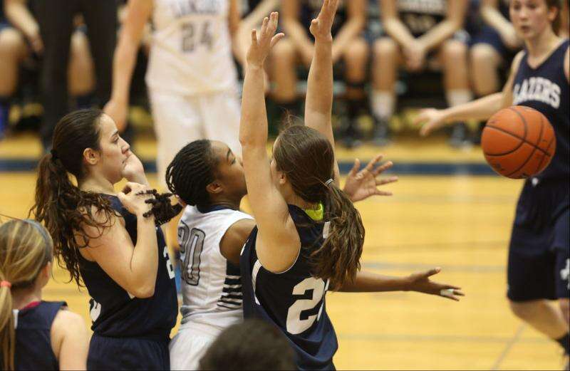 Addison Trails Stephanie Messina, left, and Kelly Delawder, right, apply defensive pressure to Lake Parks Erica Fant, center.