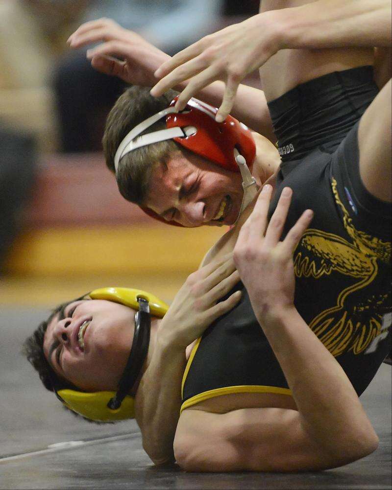 Huntley’s Nick Meyer, top, and Jacobs’ David Dudych struggle in the 115-pound weight class Thursday in Huntley. John Starks/jstarks@dailyherald.com