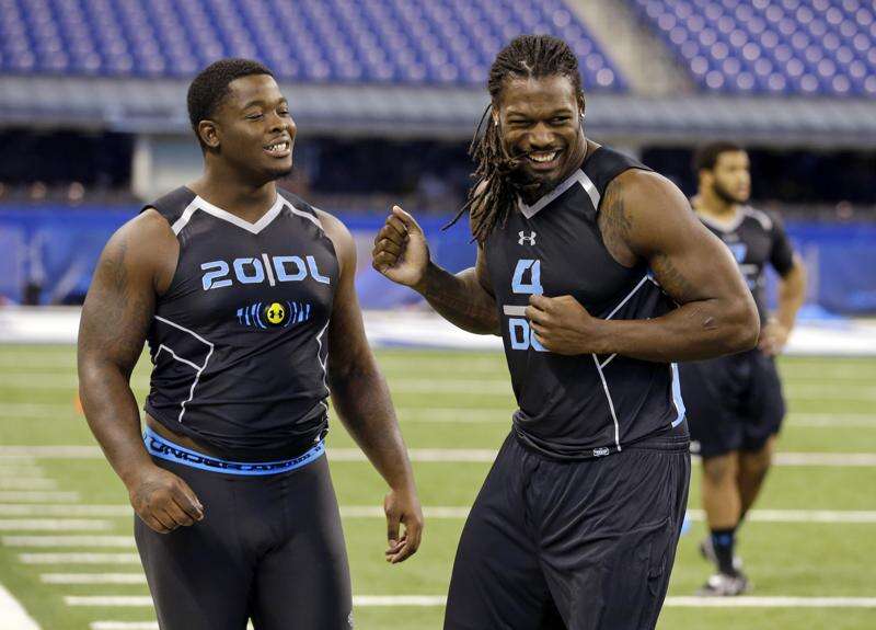 South Carolina defensive lineman Jadeveon Clowney, left, jokes with Florida State defensive lineman Timmy Jernigan during drills at the NFL football scouting combine Monday in Indianapolis. Associated Press