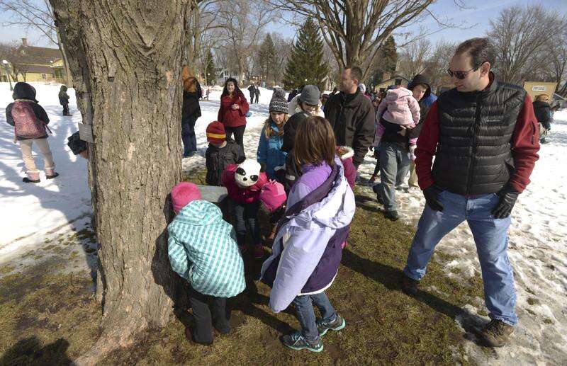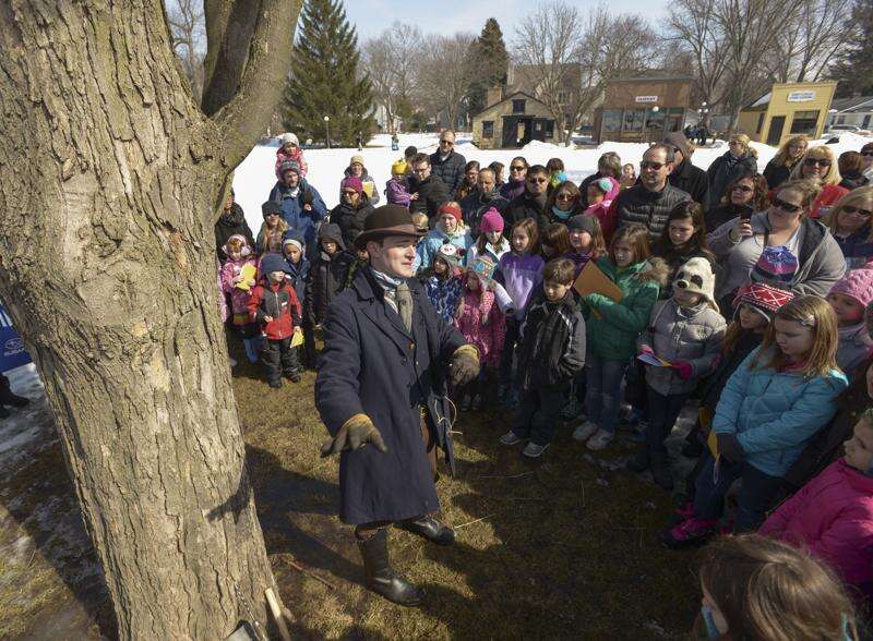 Dozens crowded around Sunday afternoon as Stech showed how farmers used to drill holes in maple trees and then insert a small spout, which allowed sap to drip out of the tree and into a bucket.