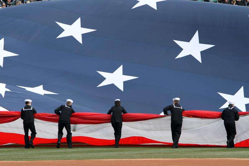 Sailors from Great Lakes Naval Base unfurl a giant American flag.
