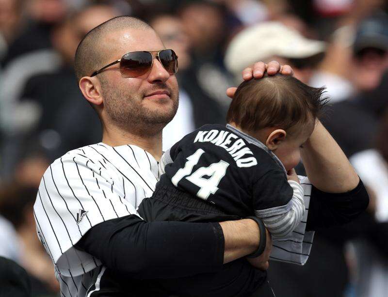 Chicago White Sox first baseman Paul Konerko waves to the crowd during player introductions.