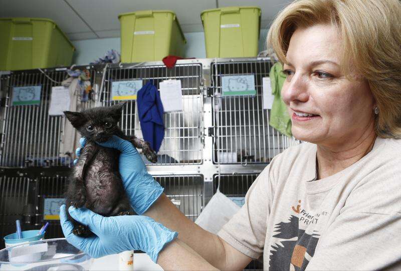 Volunteer Sarita Carden holds up Aragorn to check his progress at the Best Friends Animal Society kitten nursery in the Mission Hills area of Los Angeles. Associated Press