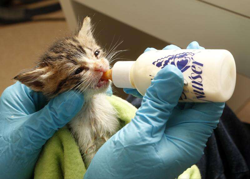 A kitten is fed from a bottle at the Best Friends Animal Society kitten nursery in the Mission Hills area of Los Angeles. Associated Press