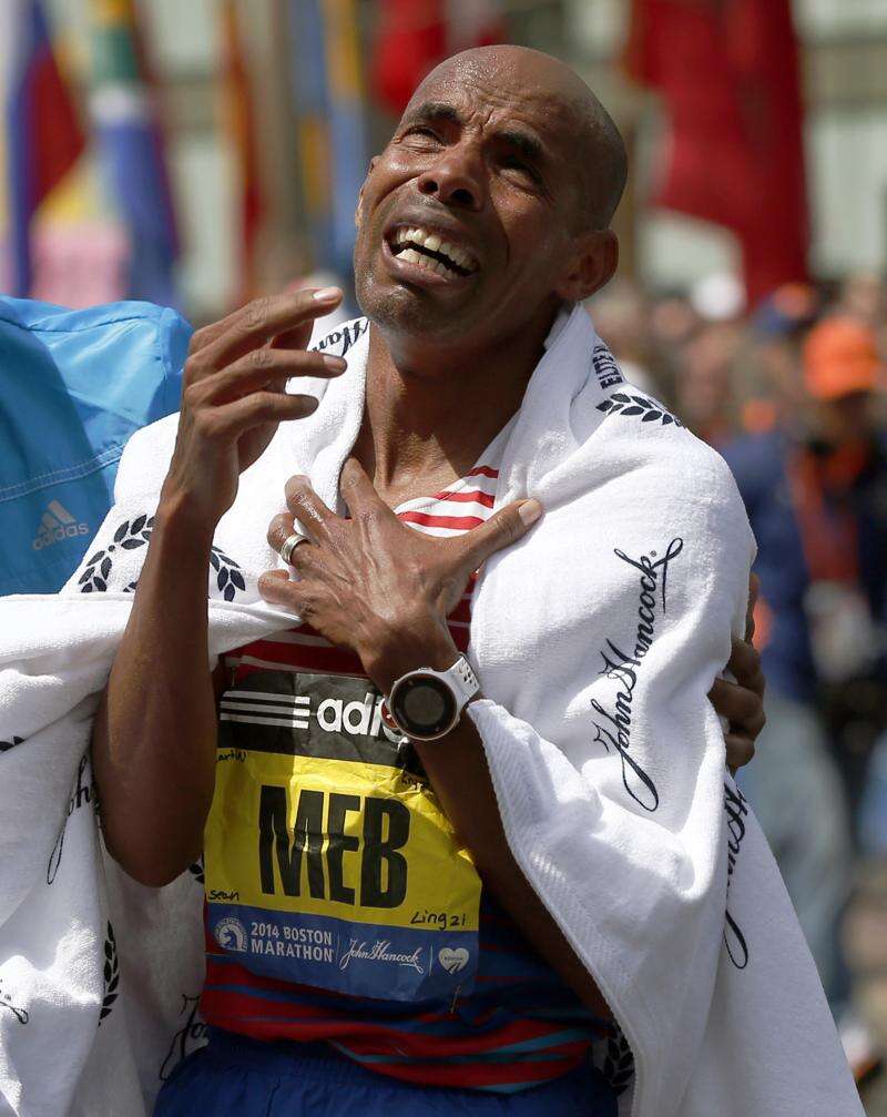 Meb Keflezighi, of San Diego, Calif., becomes emotional after winning the 118th Boston Marathon, Monday, April 21, 2014, in Boston.