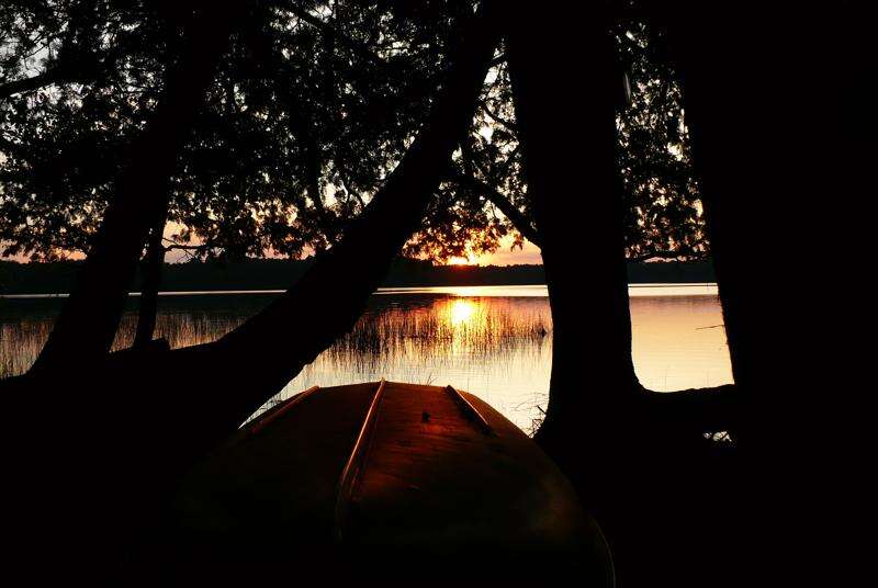 This was taken on Palmer Lake in northern Wisconsin. I liked the way the pines looked dark as they framed the image of the setting sun on the lake and its reflection on the bottom of the boat.