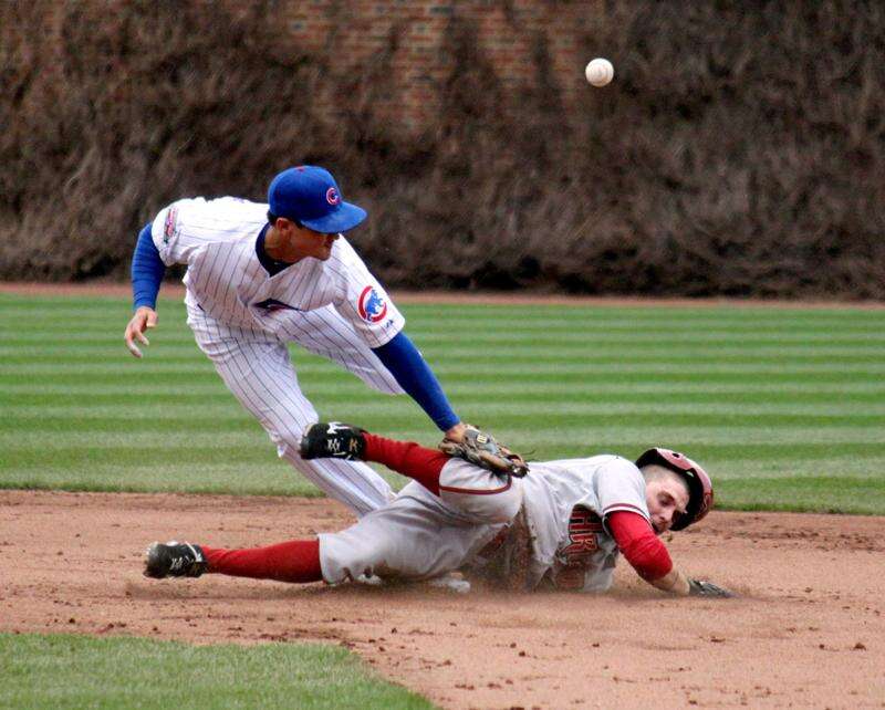 Tony Campana of the Arizona Diamondbacks steals second base against the Chicago Cubs as the ball gets away from Darwin Barney on April 24.