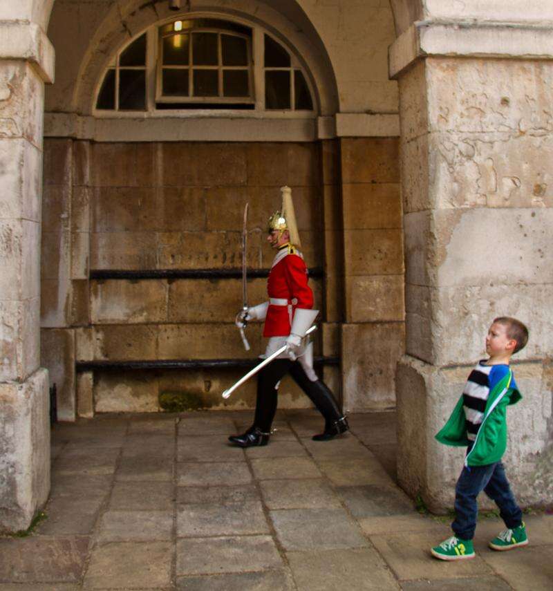A young boy enjoys trying to march like the Queen's Guard at Buckingham Palace in the area adjacent to the palace in London.
