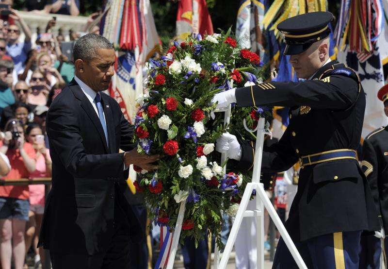 President Barack Obama lays a wreath at the Tomb of the Unknowns at Arlington National Cemetery in Arlington, Va., Monday, May 26, 2014. President Obama is leading the nation in remembering its war heroes, the fallen and those still defending the flag, in a Memorial Day tribute.