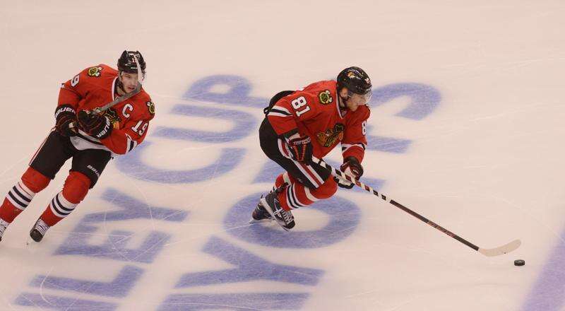 Chicago Blackhawks right wing Patrick Kane and Chicago Blackhawks left wing Brandon Saad try to score in the first OT.