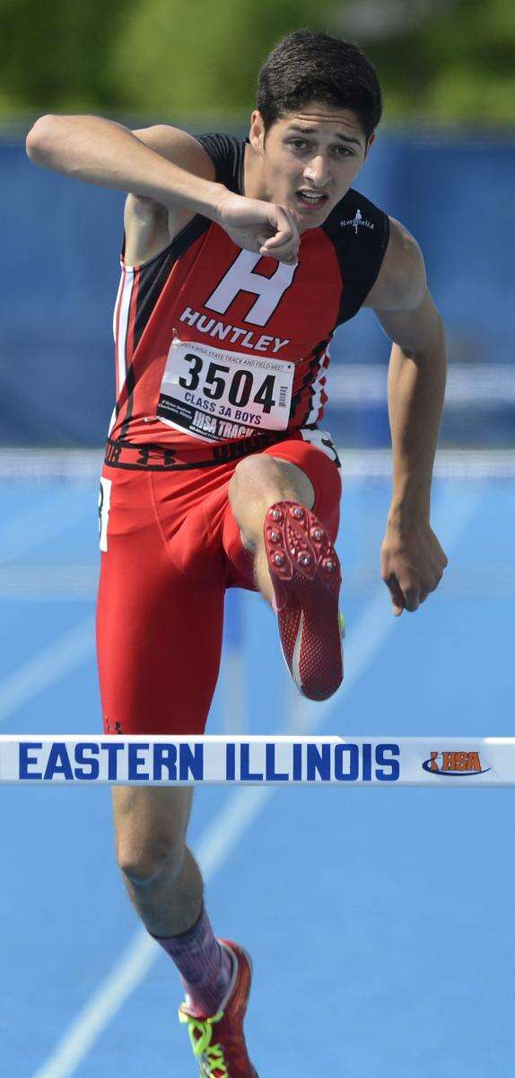 Huntley's Brennan Bell crosses the final hurdle while competing in the 300-meter intermediate hurdles during the boys Class 3A state track and field preliminaries in Charleston Friday.