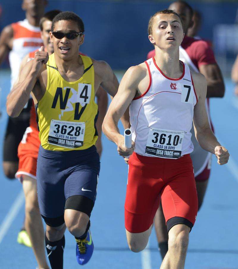 Neuqua Valley's Ty Moss, left, and Naperville Central's Sam Bransby cross the finish line in adjacent lanes while running in the 4x400-meter relay during the boys class 3A state track and field finals in Charleston Saturday.