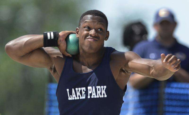 Lake Park's Curtwan Evans makes his throw on the shot put during the boys class 3A state track and field finals in Charleston Saturday
