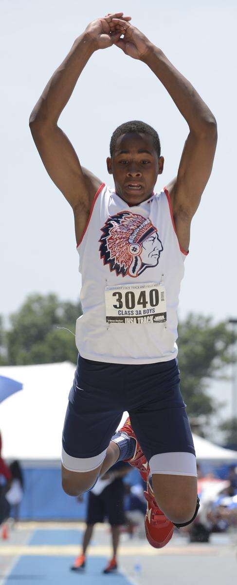 West Aurora's DaVion Cross competes in the triple jump during the boys class 3A state track and field finals in Charleston Saturday.