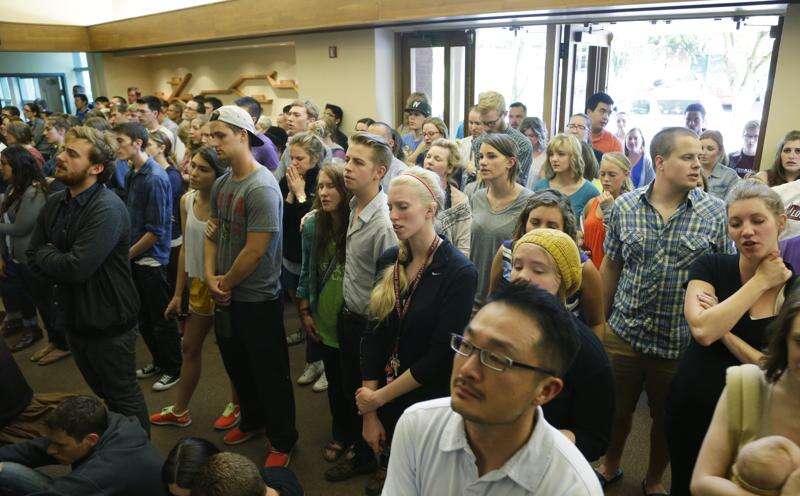 People stand in the foyer during a prayer service at the First Free Methodist Church Thursday at Seattle Pacific University in Seattle, where a shooting took place Thursday afternoon. associated press