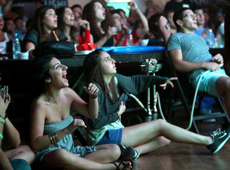 Lebanese soccer fans cheers during the first soccer match of the World Cup between Brazil and Croatia, at a fan park, in downtown Beirut, Lebanon, Thursday June 12, 2014.