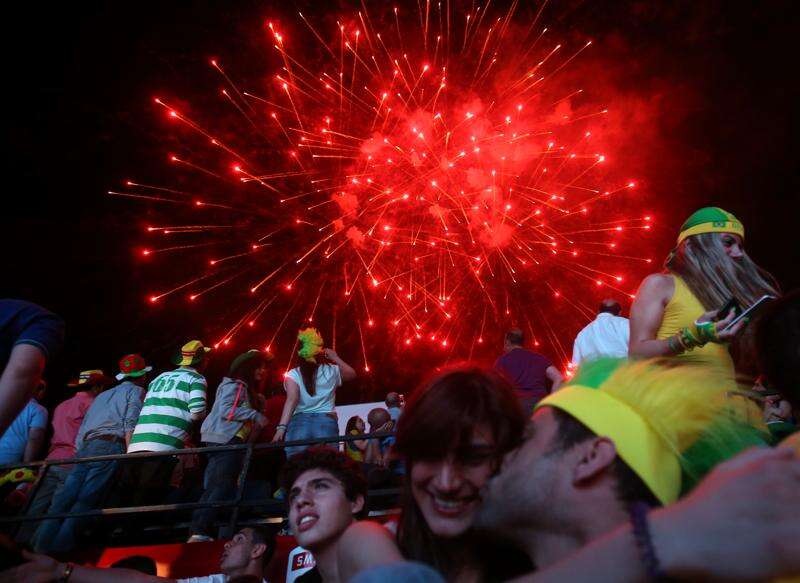 Lebanese soccer fans watch fireworks a few minutes before the first soccer match of the World Cup between Brazil and Croatia, at a fan park in downtown Beirut, Lebanon.