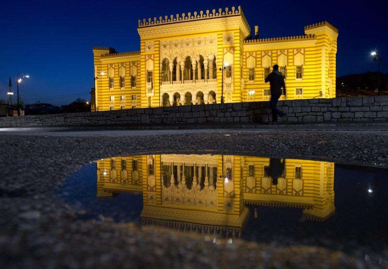 The City Hall is reflected in a puddle in Sarajevo, Bosnia-Herzegovina. The city will host a number events around the Centenary of World War I, including a conference of historians and a concert. Associated Press
