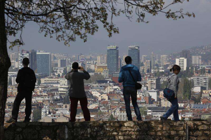 Visitors take photos and look at an overview of the city of Sarajevo, Bosnia-Herzegovina. Associated Press