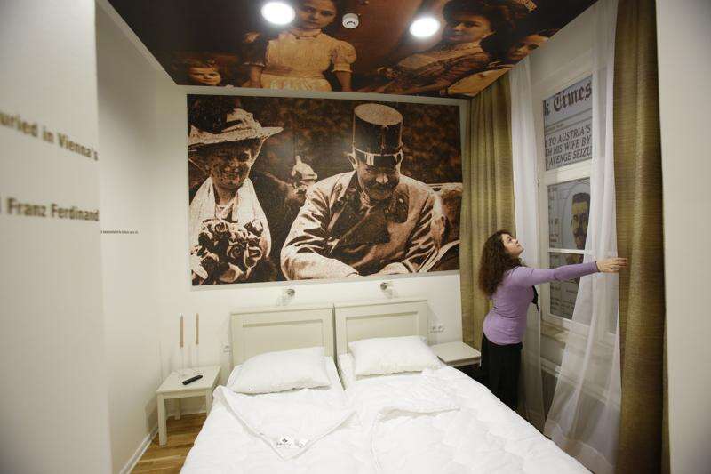 Hostel manager Nirela Smajovic fixes up a room in the Franz Ferdinand hostel in Sarajevo, Bosnia. The hostel aims to liven up the memory of the June 28, 1914 assassination of the heir to the Austro-Hungarian throne by Bosnian Serb student Gavrilo Princip. A number of events are planned in Sarajevo around the Centenary of the assassination that triggered World War I. Associated Press file photo