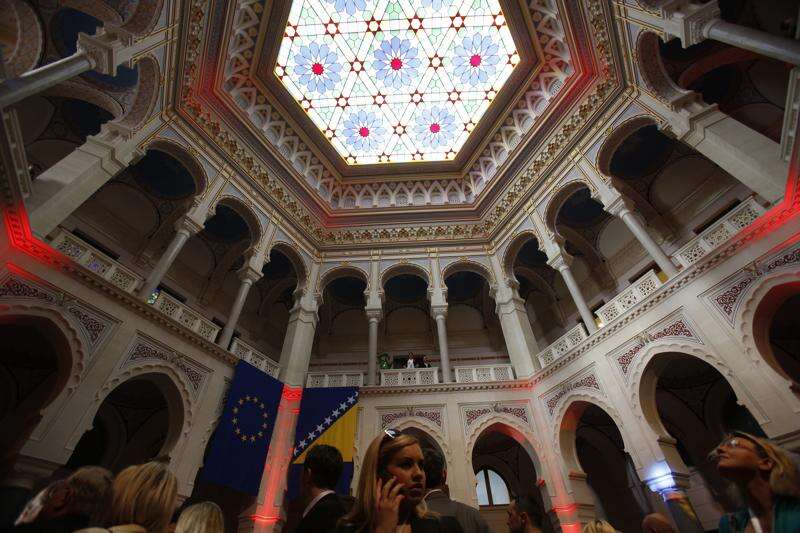 Visitors look at decorations in the newly reopened National Library in the Bosnian capital of Sarajevo. Sarajevo reopened its reconstructed National Library building 22 years after the city landmark was destroyed during the Bosnian war along with its almost 2 million books and manuscripts. The reopening comes in time for the June ceremonies that will mark the Centenary of the beginning of World War I. Associated Press