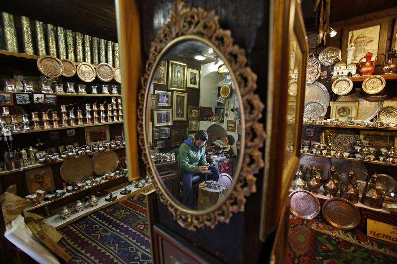 A Bosnian man produces handmade souvenirs in a shop in the old town known as Bascarsija in Sarajevo, Bosnia-Herzegovina. Associated Press