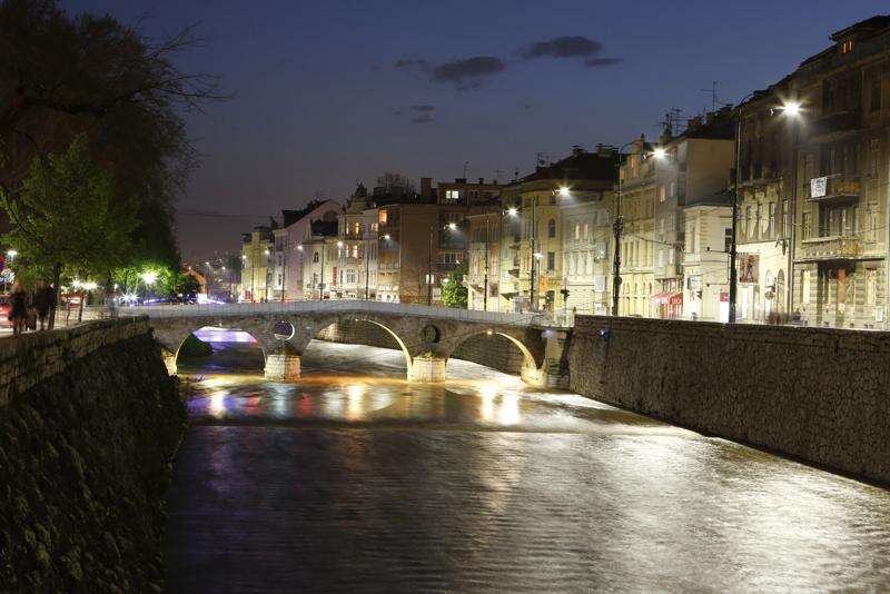 Princip Bridge and the surrounding buildings are illuminated at night in Sarajevo, Bosnia-Herzegovina. Associated Press