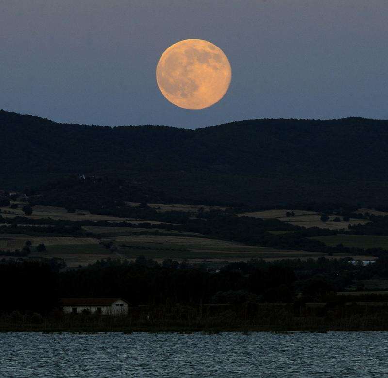 A perigee moon also known as a supermoon rises above Dojran Lake in southeastern Macedonia, Saturday, July 12, 2014. The phenomenon, which scientists call a "perigee moon," occurs when the moon in its elliptical orbit is relatively close to Earth and seen from the Earth near the horizon, appears larger and brighter than other full moons.