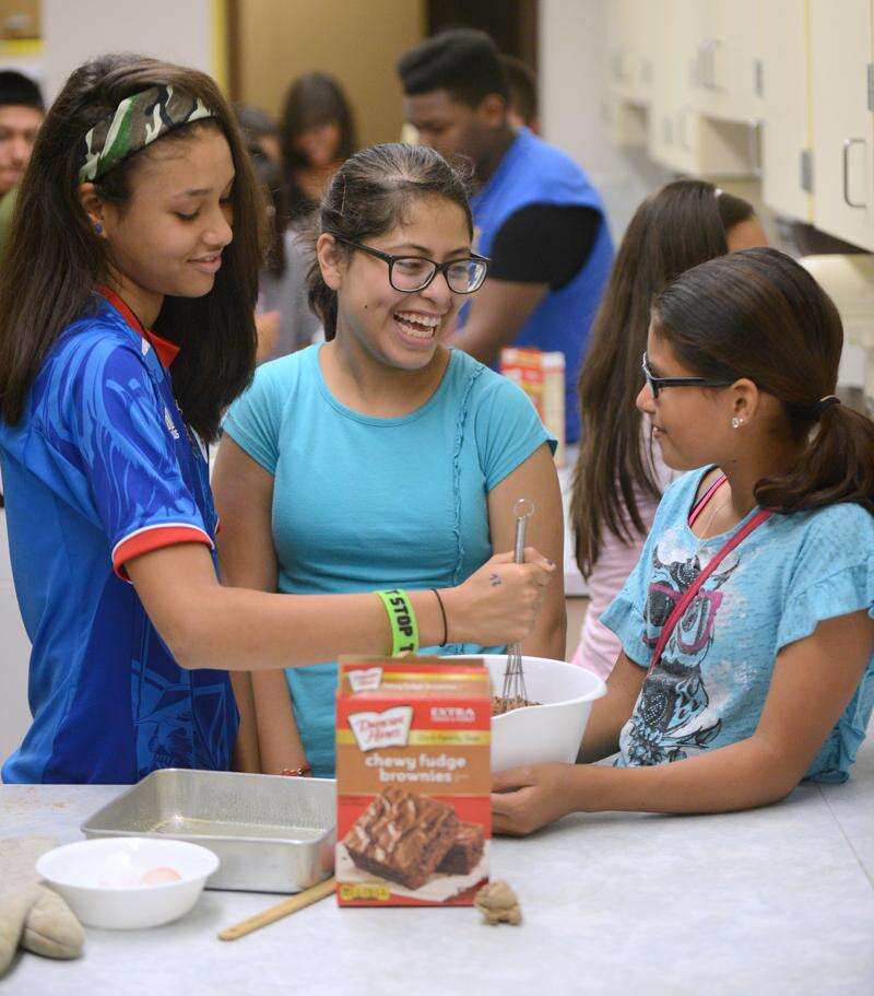 Yamaira Nieves, left, stirs a brownie mix while Alisha Ramos, center, and Daniela Ramirez, all 13, wait for their turn during a cooking class Tuesday at the Elgin Police Department's Kids United program at Abbott Middle School in Elgin. After dinner, they would be able to enjoy the brownies served with ice cream. Alisha has been coming to the program since she was 9. Laura Stoecker/lstoecker@dailyherald.com
