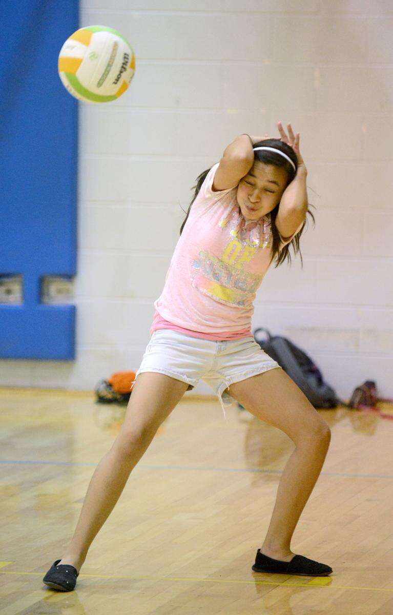 Natalie Munoz, 13, ducks while playing volleyball Tuesday at the Elgin Police Department's Kids United program at Abbott Middle School in Elgin. Laura Stoecker/lstoecker@dailyherald.com