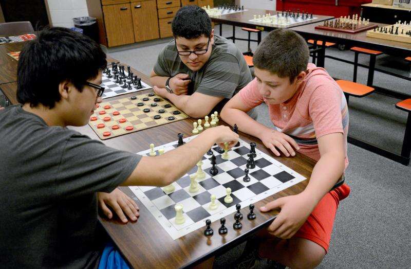 Jose Gomez, 15, left makes his move while playing against Carlos Galarza, 14, as Fabian Lechuga, 13, observes Tuesday at the Elgin Police Department's Kids United program at Abbott Middle School in Elgin. Jose has been coming to the program since he was 8 years old. Now the minimum age to attend is 9. Laura Stoecker/lstoecker@dailyherald.com