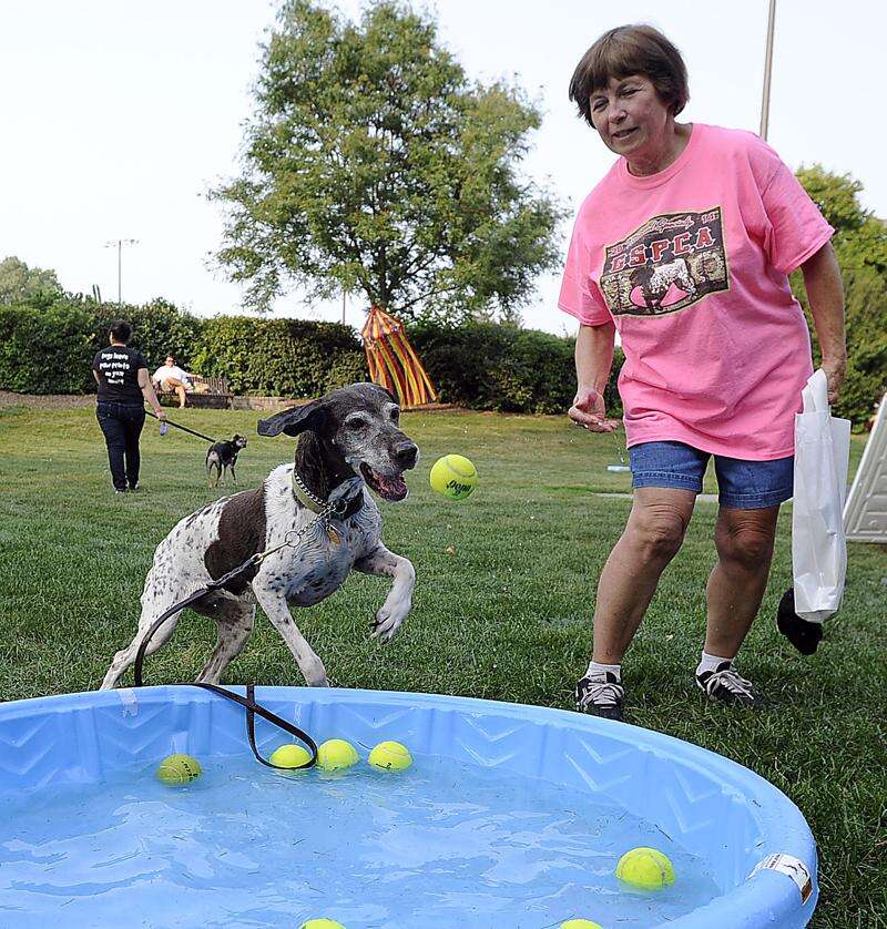 Mark Welsh/mwelsh@dailyherald.comPat Beckstrom and her German short hair pointer Daisy, also an excellent tennis player goes after a tennis ball at the dog carnival in Palatine on Thursday.