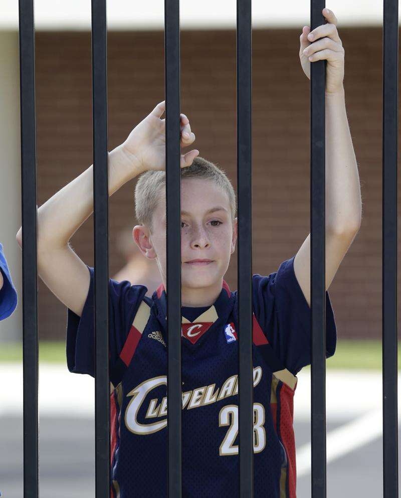Kolten Kurtz, 11, looks into the stadium before the LeBron James homecoming Friday, Aug. 8, 2014, in Akron, Ohio. James is being welcomed back Friday night by the city where he first bounced a basketball. The NBA superstar is being celebrated with an event expected to draw more than 25,000 people to InfoCision Stadium. James grew up in Akron and has maintained a strong connection with his hometown.(AP Photo/Tony Dejak)