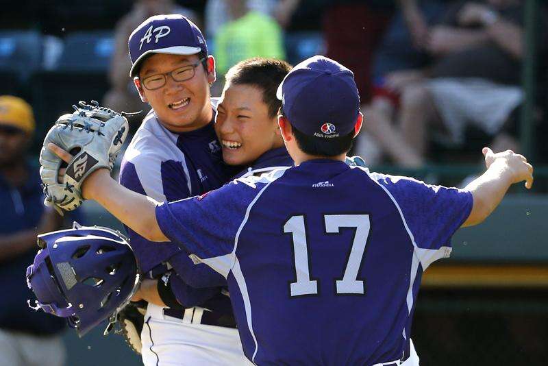 South Korea's Hae Chan Choi, top center, celebrates with teammates after getting the final out of a 8-4 win in the Little League World Series championship baseball game against Chicago.