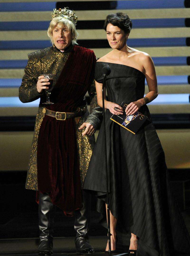Andy Samberg, left, and Lena Headey present the award for outstanding miniseries on stage at the 66th Annual Primetime Emmy Awards.
