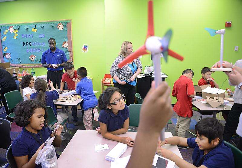 A miniature wind turbine is held in the air as students, including Carmen Rivera, left, Anahi Uribe and Isaac Garcia, all 9, start to build their project Tuesday at the Boys & Girls Club of Elgin. Siemens USA brought its STEM (Science, Technology, Engineering and Math) program to club members to teach them about clean energy and the possibility of technical careers.