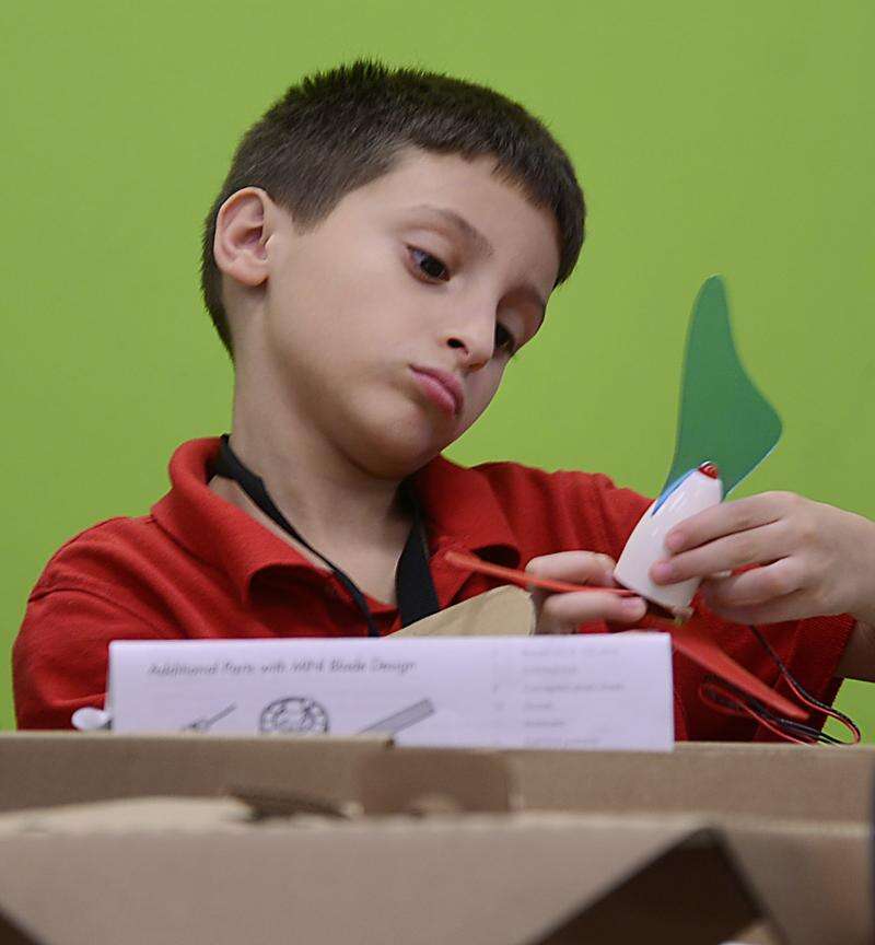 Yandel Garcia, 9, studies the pieces for a miniature wind turbine at the Boys & Girls Club of Elgin as Siemens USA put on a STEM (Science, Technology, Engineering and Math) program Tuesday.