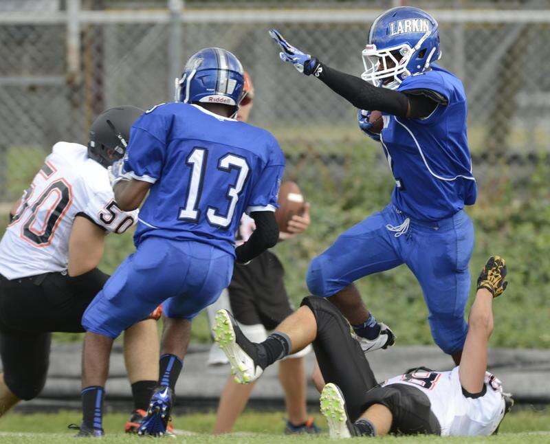 Larkin's SeShawn Steward celebrates a touchdown after scooping up a teammate's fumble against McHenry Saturday at Memorial Field in Elgin.