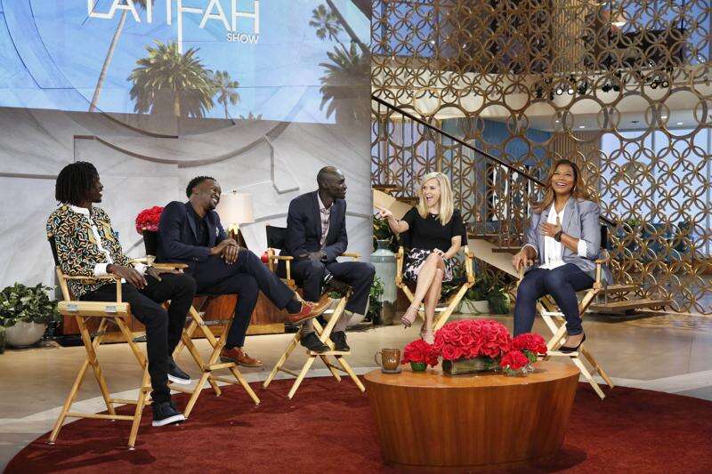 Emmanuel Jal, left, Arnold Oceng, Ger Duany and Reese Witherspoon from the film "The Good Lie" talk with Queen Latifah during a taping of "The Queen Latifah Show," which returns Monday. ASSOCIATED PRESS/SONY PICTURES TELEVISION