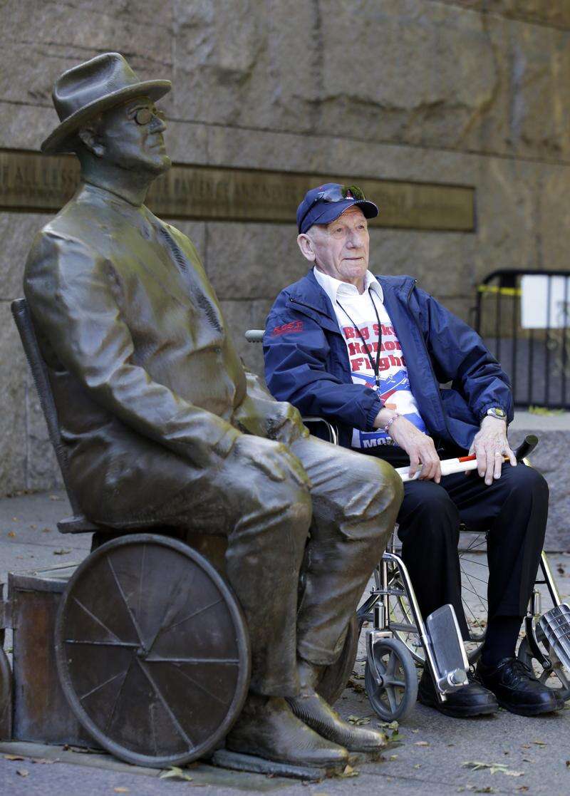 World War II veteran Svend Wind, of Anaconda, Mont., poses with the Franklin Delano Roosevelt Memorial in Washington. The memorial is one of a number of places connected to the Roosevelts around the country that may experience an uptick in interest as a result of Ken Burns' documentary about the Roosevelts. Associated Press File Photo