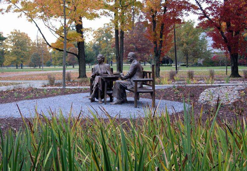 Visitors take pictures in front of a bust of President Franklin D. Roosevelt at Franklin D. Roosevelt Four Freedoms Park, located on Roosevelt Island in New York. The park is considered an architectural masterpiece and celebrates an FDR speech extolling four essential freedoms: freedom of expression, freedom of religion, freedom from want and freedom from fear. Associated Press