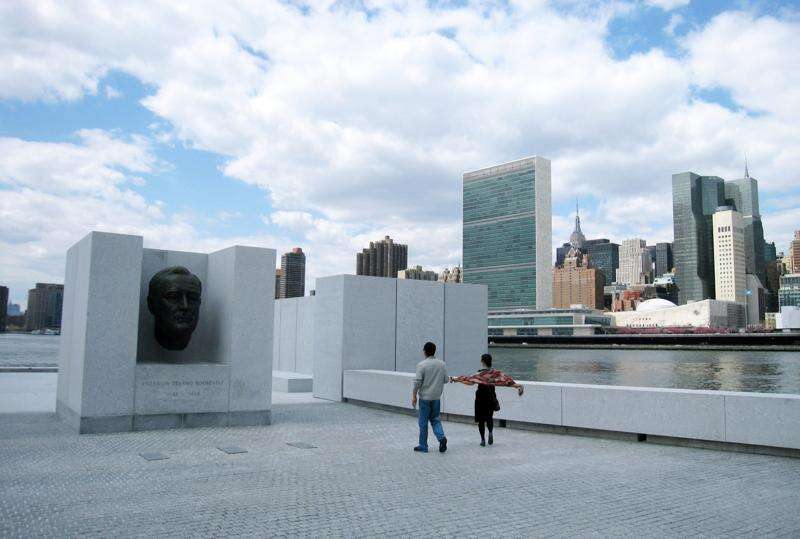 Four Freedoms Park: This park, located on Roosevelt Island in New York City's East River, memorializes FDR's "Four Freedoms" speech, made in 1941, extolling freedom of speech, freedom of worship, freedom from want and freedom from fear. An excerpt is engraved on a granite monument near a bust of FDR. The park, designed by architect Louis I. Kahn, is considered a sleek Modernist masterpiece. Its tree-lined plazas, steps and other structures offer vantage points full of symmetry and angled views for seeing the Manhattan skyline. Reachable via subway or the Roosevelt Island tram. fdrfourfreedomspark.org/.