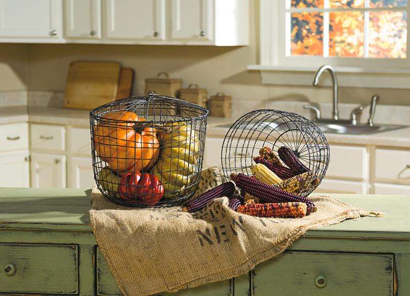 Stock wire baskets with vibrant fillers, from pumpkins to Indian corn, and group them atop a burlap feed sack for a cohesive feel. Add more charm with vintage-style tags or autumnal ornaments tied onto the basket lids.