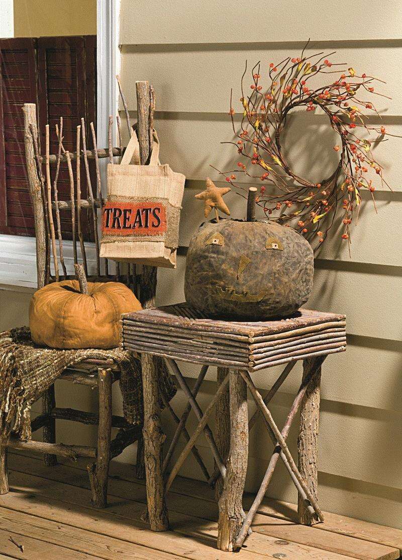 Set up a prim-inspired vignette to greet candy seekers and any other guests by mixing fabric pumpkins, twig furniture and brighter accents, such as a bittersweet wreath or painted shutters. To dress up a plain canvas trick-or-treat sack, put letter stickers on orange burlap, adhere it to a length of natural burlap, and glue the fabric to the front and back of the bag.