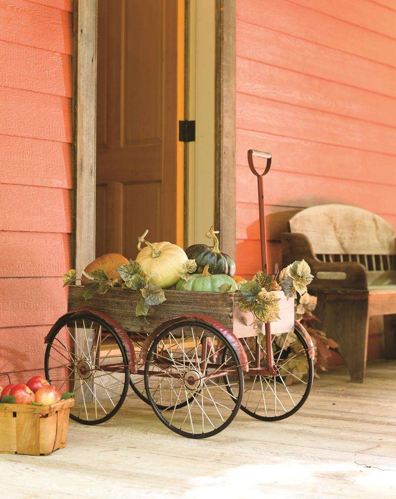 Haul in a bounty of autumn cheer by setting up a rustic wagon on the front porch or in the yard. For a simple-yet simply sensational-scene, pile plump pumpkins of various colors inside and arrange a few vines for dimension. Or, get more creative with the contents: Make different display levels with stacked hay bales, wind bittersweet garland around the handle or the wheels, or position a scarecrow in front to look like he's driving the cart.