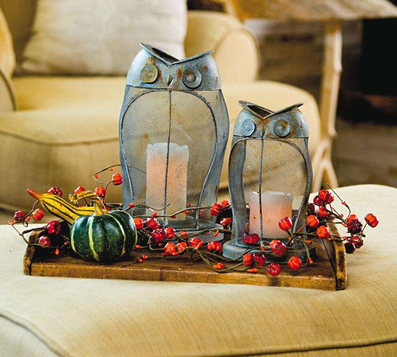 Currently fashionable as a year-round icon, owls truly shine at harvesttime. These rustic metal candle lanterns feature a distressed finish perfectly suited to country rooms. Arranged on a wood tray with colorful garland and miniature gourds around their base, they can set any counter, table, bookshelf or other surface aglow with weathered charm. Outfit them with white battery-powered candles for a no-fuss display, or pick a pretty hue for more pizzazz.