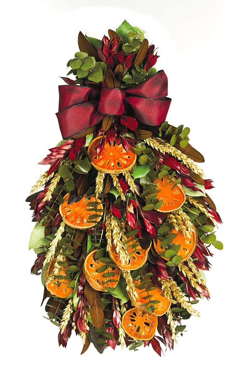 Instead of giving your front door the regular runaround, consider a floral swag instead of a wreath. Choose one with a wide variety of textures and natural colors, such as this jubilant arrangement.