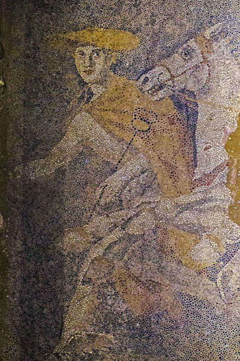 The mosaic, 10 feet long and 15 feet wide, depicts a horseman with a laurel wreath driving a chariot drawn by two horses and preceded by the god Hermes. According to a Culture Ministry announcement on Sunday, Hermes is depicted here as the conductor of souls to the afterlife.
