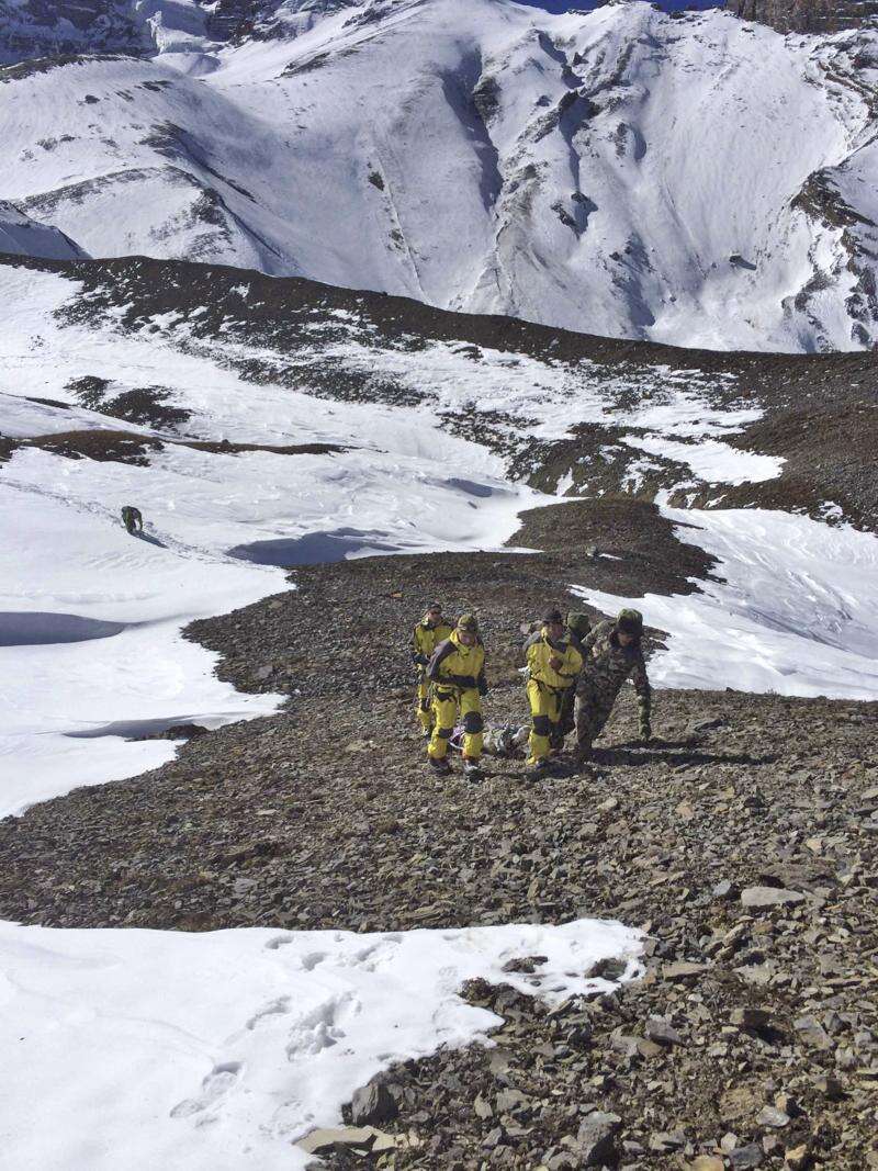 KATMANDU, Nepal - Search teams in army helicopters rescued dozens of stranded foreign trekkers and recovered more bodies of victims of a blizzard and avalanches in Nepal's northern mountains Thursday, raising the death toll to 27.